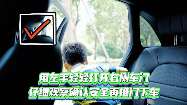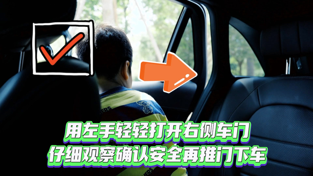 用距离车门较远的那只手开车门。当驾驶员换成离车门较远的那只手,即右手开门时,上半身会自然而然地转动,头部和肩膀不由地向外看,便能及时观察到后面驶来的车辆。