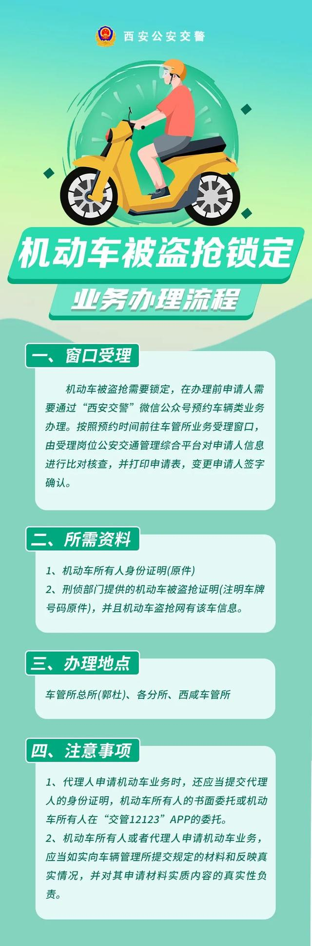 机动车申请机动车被盗解锁业务的,机动车所有人应当向登记地车辆管理所申请,在办理业务前,申请人需通过“西安交警”微信公众号“车驾管窗口业务”小程序进行预约。按照预约时间前往车管所业务受理窗口进行办理。