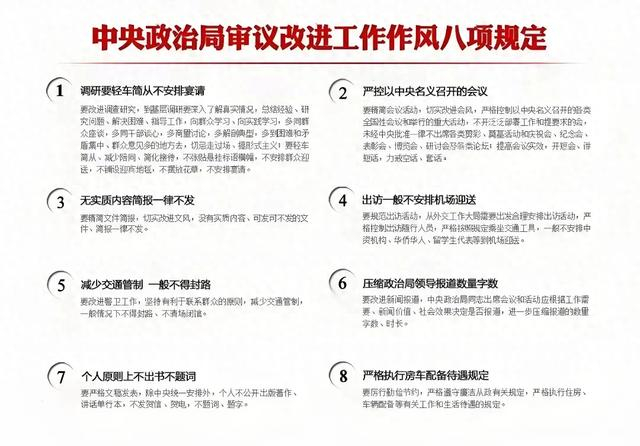 2012年12月4日,中央政治局召开会议,审议通过了《十八届中央政治局关于改进工作作风、密切联系群众的八项规定》,因为其主要内容有八项,所以简称为“中央八项规定”,内容包括改进调查研究、精简会议活动、精简文件简报、规范出访活动、改进警卫工作、改进新闻报道、严格文稿发表、厉行勤俭节约等8个方面。