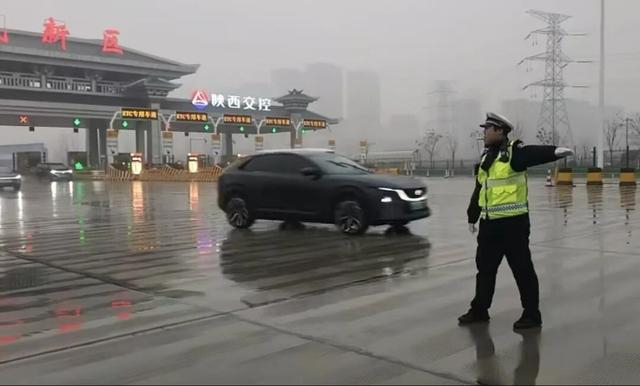 12月31日,西安市公安局西咸新区公安局交管大队为保障雨雪天气交通安全畅通,在高速口及车流密集路段指挥疏导,并对过往群众进行雨雪天气安全出行提示,提醒大家注意行车安全。