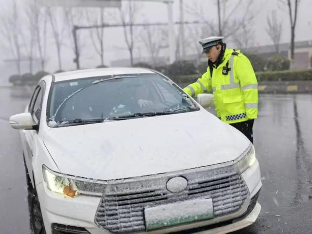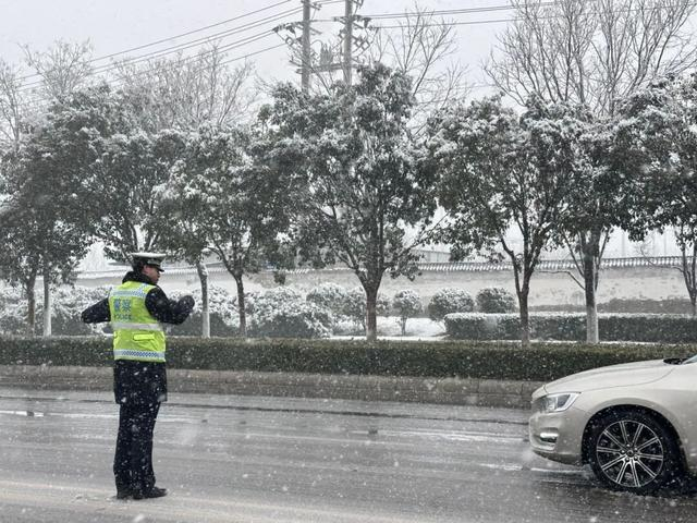 民警们坚守岗位,指挥车辆有序通行,提醒过往司机减速慢行、保持安全车距,全力守护雪天道路交通安全畅通。