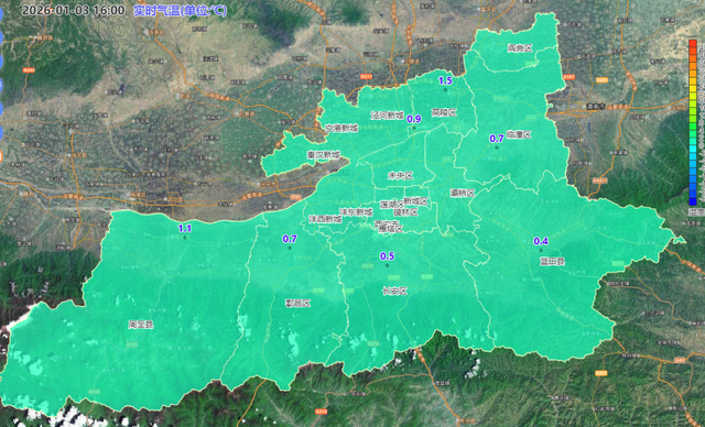 1月3日16时西安市气温实况色斑图