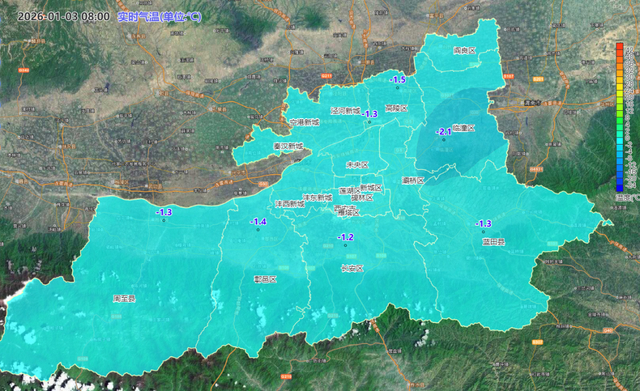1月3日08时西安市气温实况色斑图