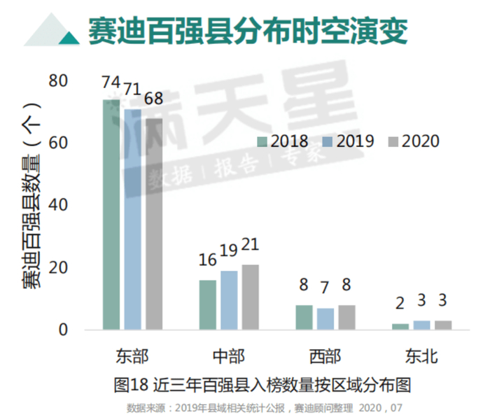 从下图可以看出,东部百强县数量处于绝对碾压中,在人口、交通、产业结构等影响下,西部和中部百强县的数量相对偏少,但好消息是东西部百强县的数量差正在逐渐缩小,说明中部县域经济发展迅猛,各地都在新形势下寻求新的发展机遇,“酒香也怕巷子深”,传统的思维在新时代而电商成为新经济下重要的发展突破口。