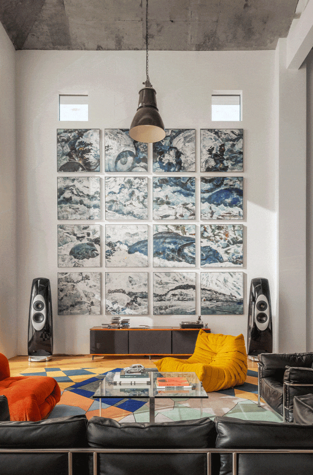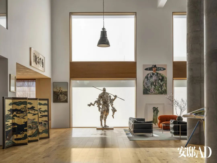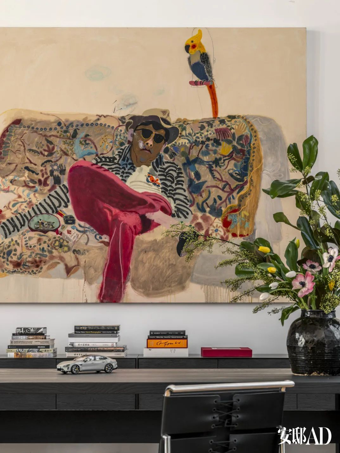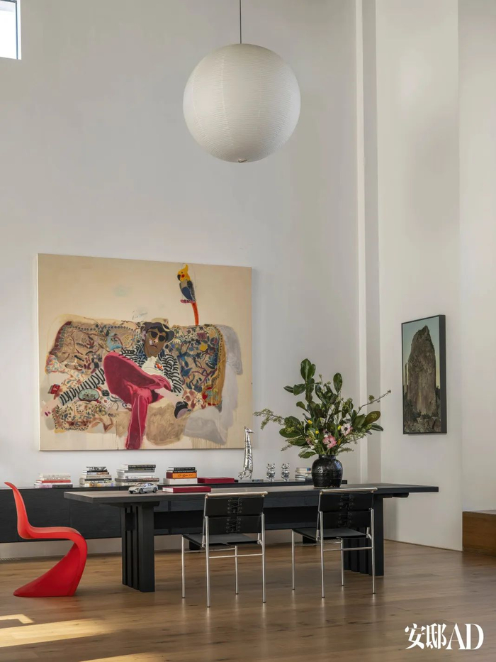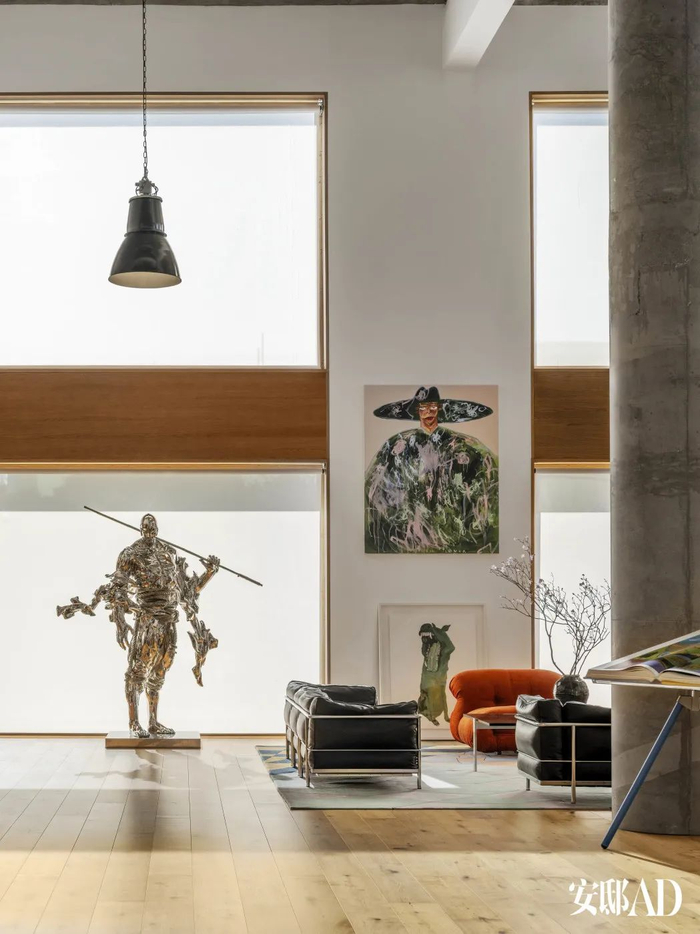 黑色主沙发及橙红色单人沙发均来自品牌Cassina,窗边的雕塑是来自艺术家任哲的作品《青影寒》,悬挂在墙上的作品是出自萨尔瓦多艺术家Studio Lenca的布面油画,其下方靠在墙上的画作则来自艺术家周春芽。