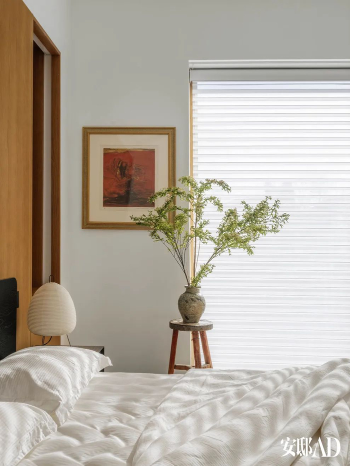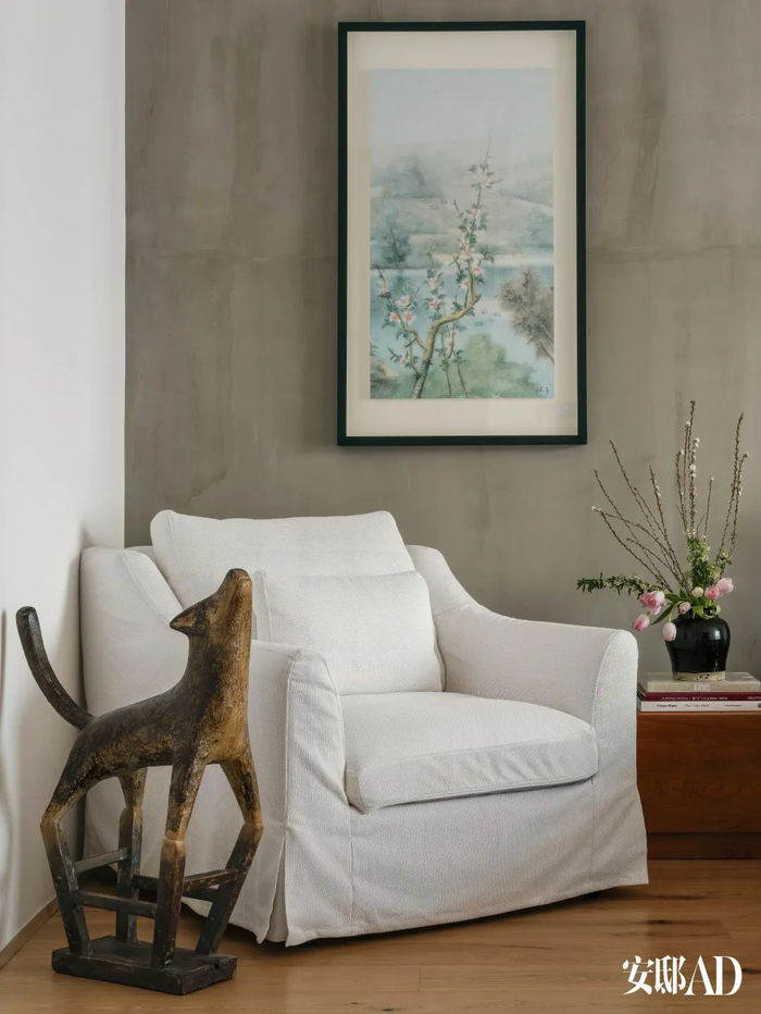 程晖无意于浮夸的外在表达,他擅长在平实质朴的空间中娓娓道来,将艺术品以园林造景的方式融入设计局部,利用曲折无尽的游园体验,不动声色地让艺术出现在生活和休闲的路线上,通过墙体的隔断和开孔、过道的勾连和转折,实现隔中有连、断中有续的层次感和通透感,不同风格的艺术品、家具陈设、插花绿植或组合或散布、或独立或交错,在明暗变幻的大小空间中推动趣味的浪潮、情绪的水波。