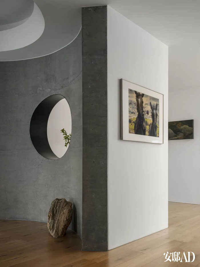 一家人的生活主要在相邻的另一栋房子里,跨进入户门,空间如中国园林般渐次展开,逐渐开阔。面环形混凝影壁上以圆窗借景,强化到家的兴致和仪式感。程晖引入建筑游园的理念,将人的脚步以廊道的线索延伸,途经清幽的门厅,明朗的书房、娴雅的半室内餐厅、敞阔的会客厅,沿途墙体开孔,绿植融入光影,林林总总的挂画、装置、家具和音响围绕中央的厨房,形成一个中西合璧的自然园林环抱空间。