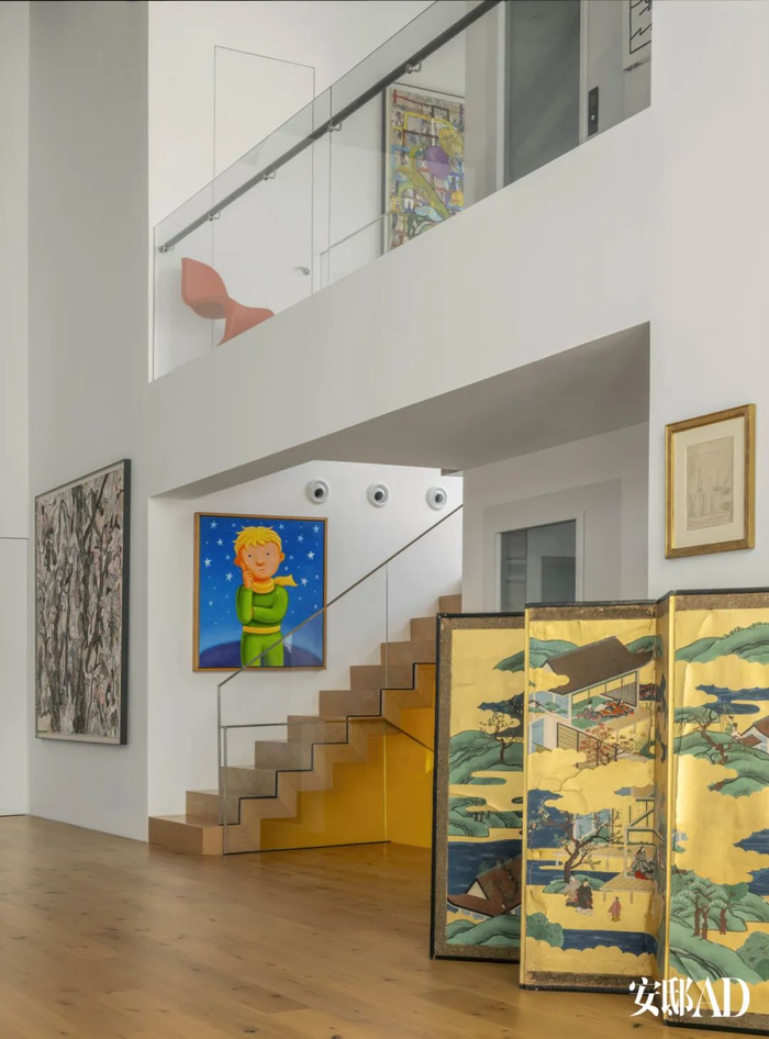 图中金色中古屏风为日本回流。楼梯位置悬挂的作品是艺术家沈敬东创作的《小王子》。