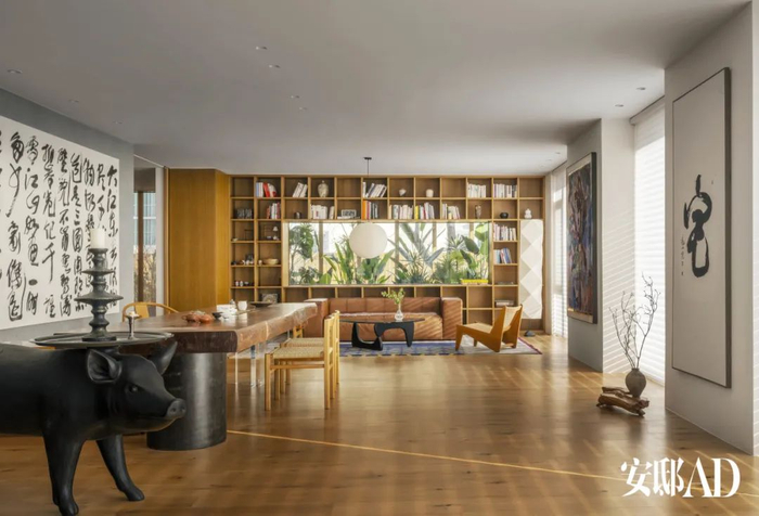 会客厅作为阳光容量最大的地方,以落地窗和漏窗向三个方向借景,引入户外花园、热带植物园和相邻的艺术空间,是生活融汇艺术的高光现场。一张厚重的柚木长桌背靠书法家王冬龄的巨幅作品法,木纹似江河汇流,书体如游龙在渊,桌面以深色铁质圆柱和透明玻璃支撑,材料质感表达阴阳虚实之意。对面悬挂作家冯唐题写的 “宅” 字,笔墨传神,一个 “宅” 字既是名词的生活归宿,也是动词的行为选择,更是形容词的个性姿态,与满屋子的书和艺术相映成趣。如此精心构造的大宅出尘人世,安顿生活,也释放心灵。