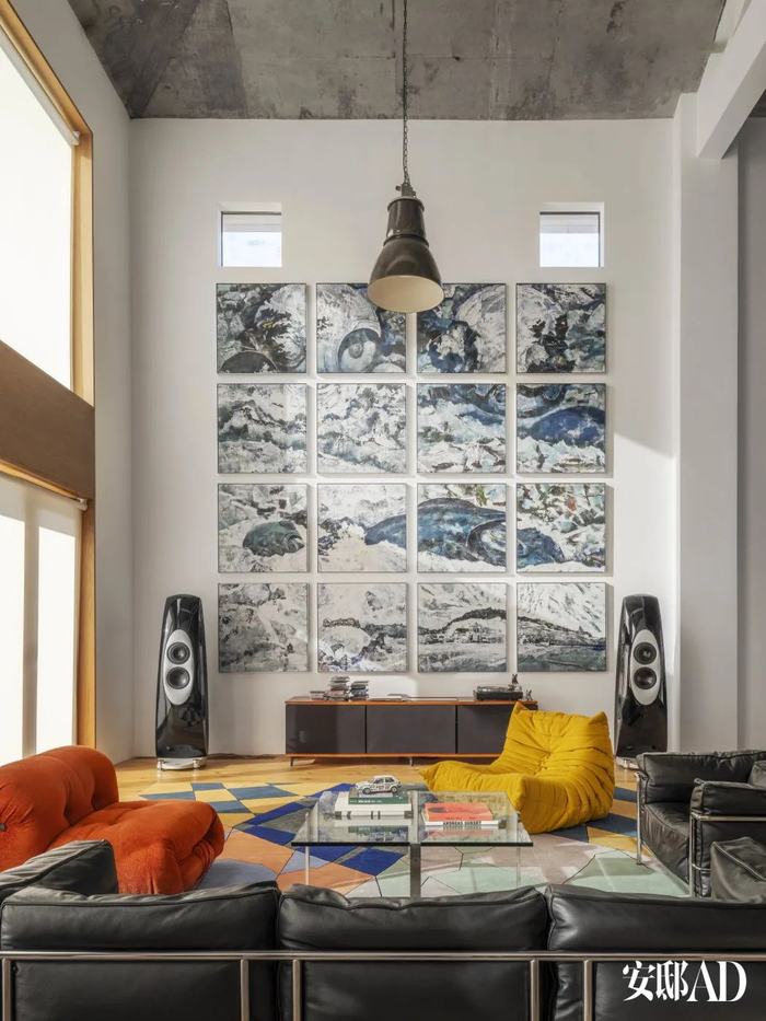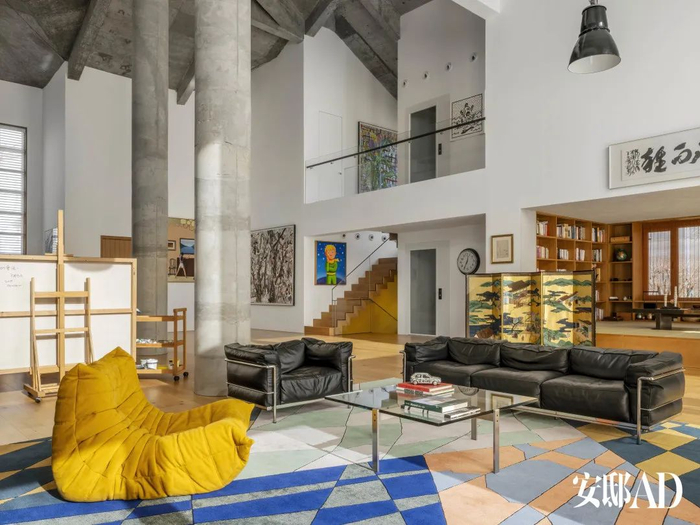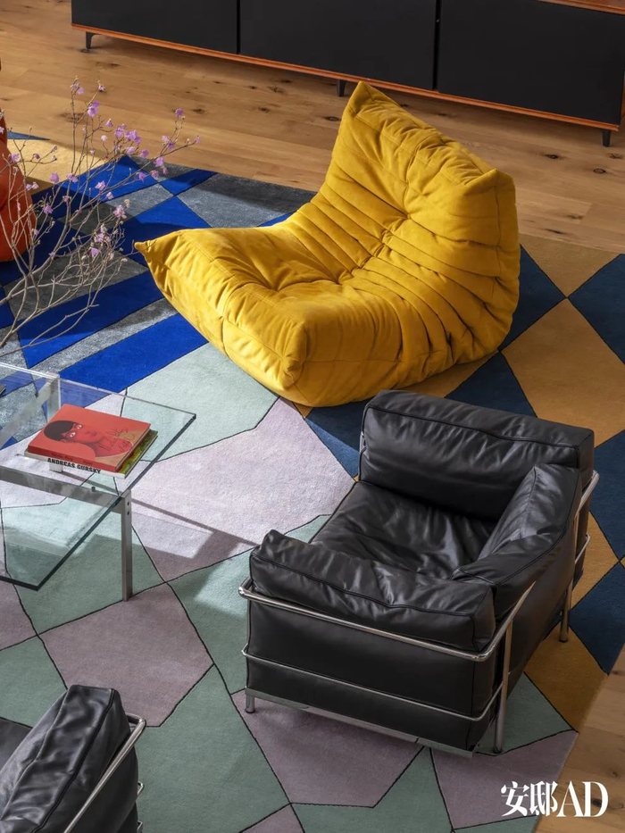 黑色主沙发来自Cassina品牌,黄色单人沙发来自 Ligne Roset,大面积的彩色几何形状拼色地毯为品牌CC-Tapis的Xequer 系列。