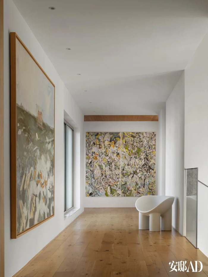 画面中心画作出自艺术家陈彧君之手,走廊中造型圆润的白色单椅来自品牌Driade。