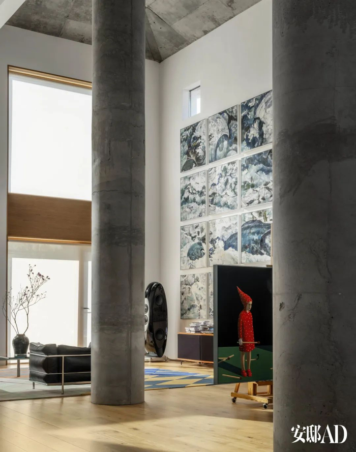 从工作室二层俯瞰,混凝土巨柱气势非凡,颇有神殿的气质,同时也为空间提供了象征性的界限,在白墙和橡木地板营造的自然氛围中,划分出三个功能区域:会客区和办公区居于明暗两侧,中间是主人创作绘画的自留地。三个区域以高墙为尽头,在几乎封闭的墙面高处开了一组有序的正方形小窗,与一侧墙的落地窗形成调性匀和的光环境,为展示艺术品提供了优越条件。
