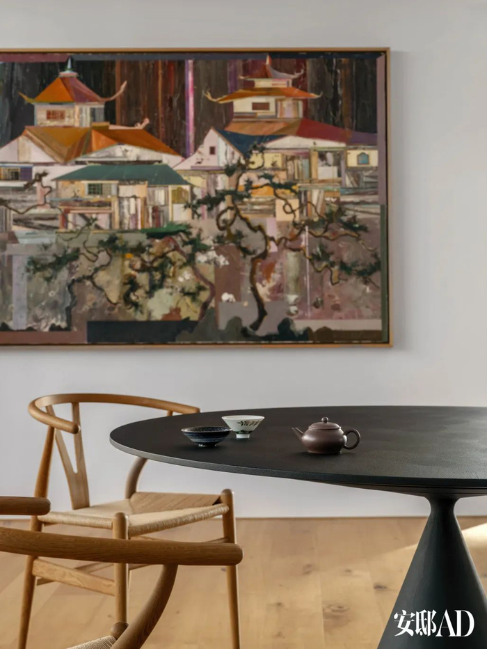 黑色圆形餐桌来自品牌DESALTO,搭配的餐椅是丹麦品牌Carl Hansen&Søn的Y Chair,这一作品是丹麦家具设计大师Hans J. Wegner的经典作品之一,被誉为北欧设计与中国元素完美结合的产物,墙上的布面油画作品出自艺术家王源远 。