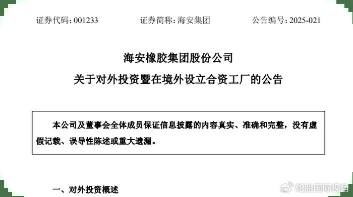 近日,海安橡胶集团股份公司发布公告,宣布拟联合多方在俄罗斯建设巨型全钢工程机械子午线轮胎工厂,总投资规模预计不超过43.19亿元人民币(折合539.90亿卢布)。