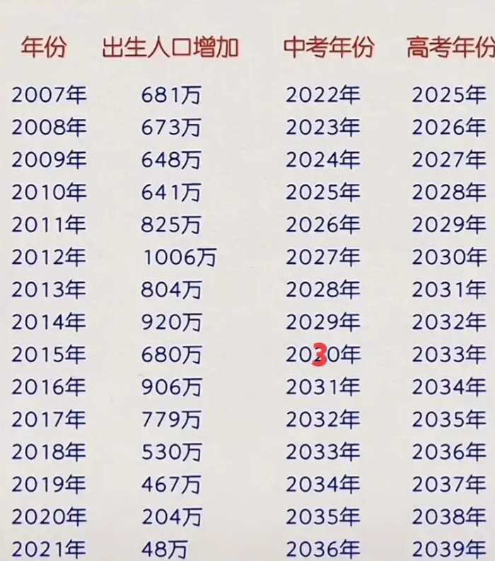 1、2020年新增人口只有204万,对应2035年的中考,2038年的高考,都是异常轻松的。