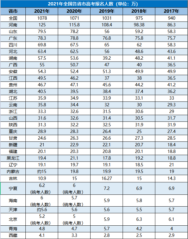 例如河南高考总被笑称为全国最难,其主要的原因,就在于河南历年高考报考人数居全国第一,屡屡超过全国高考总人数的十分之一。