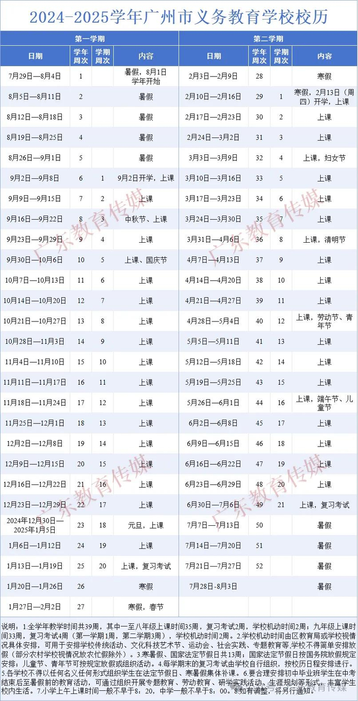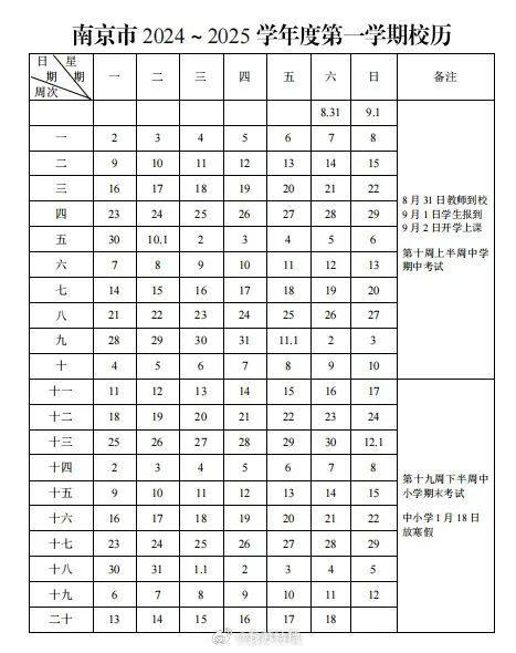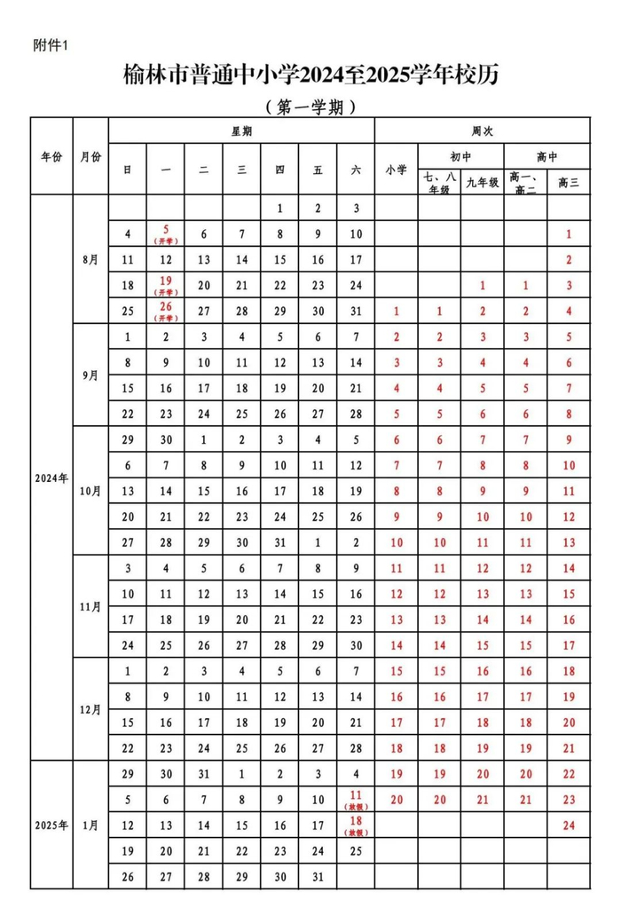 初中:七、八年级于2024年8月26日(星期一)开学上课,2025年1月11日(星期六)放假,全学期共20周。九年级于2024年8月19日(星期一)开学上课,2025年1月11日(星期六)放假,全学期共21周。