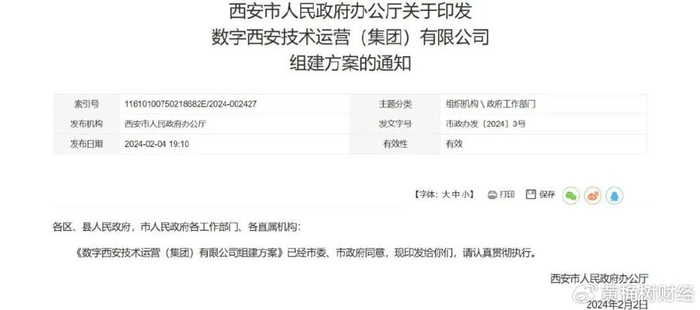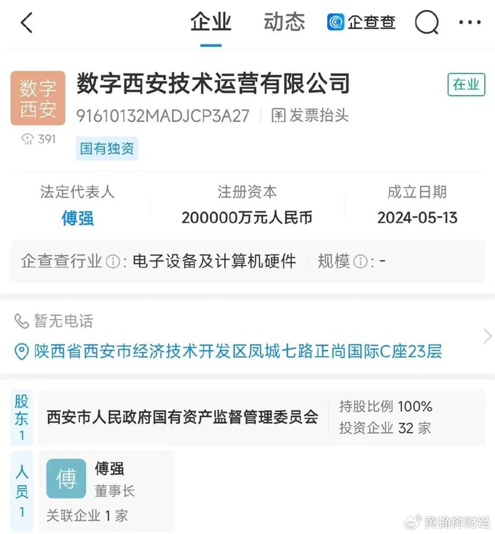企查查显示,数字西安技术运营公司已经完成工商注册,成立日期为2024年5月13日,注册资本20亿元,西安市国资委持股100%。