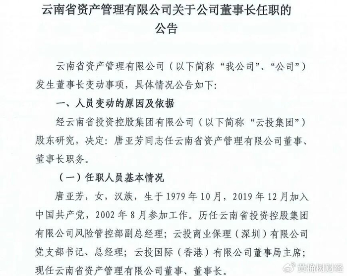 2025年12月19日,云南省资产管理公司发布了《关于董事长任职的公告》,经云南省投资控股集团党委会研究决定,唐亚芳任云南省资产管理公司董事、董事长职务。
