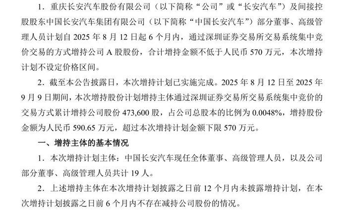 但是坦率而言,二级市场并没有给予正面反馈,截至2025年12月末,长安汽车报收于11.86元/股,这一个价格甚至把2025年下半年增持的董事高管集体套牢了——2025 年 8 月 12 日至 2025 年9 月 9 日,长安汽车19位董事高管一共斥资590.65 万元增持了47.36万股,增持成本为12.47元/股,扣除2025年11月“10股派0.5元”的分红,增持成本为12.42元/股。
