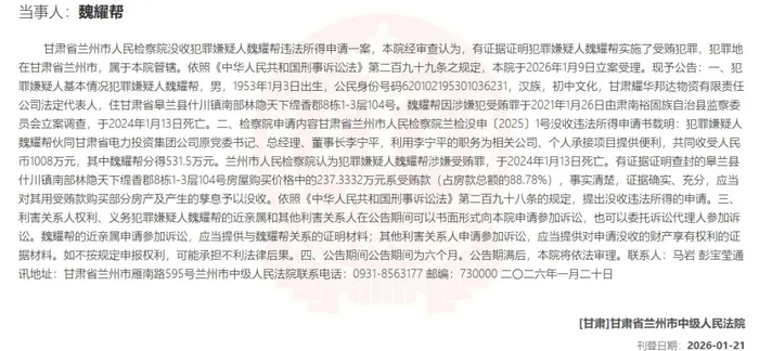 黄桷树财经注意到,虽然魏耀帮已离世,但对其违法所得的追缴程序并未终止。甘肃省兰州市中级人民法院发布的最新公告显示,公告期为六个月,公告期满后,将依法审理没收魏耀帮违法所得一案。