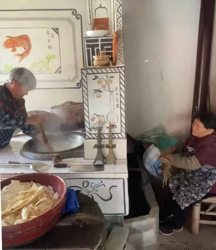 不一会儿,一张又薄又脆的锅糍就出锅了。围着灶台的是看热闹的邻里村民和前来蹭吃的小孩,红彤彤的灶火映红了大家的脸膛,与屋外寒风凛冽相比,好一番温暖幸福场景。