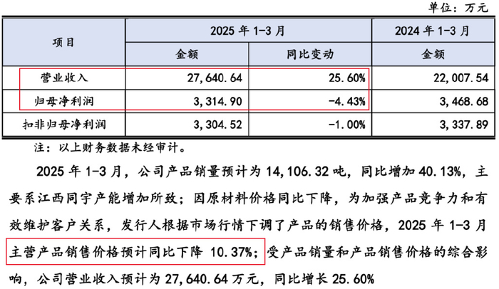 即便深知产品售价下滑的影响,同宇新材还在降价。其预计,2025年一季度主营产品销售价格同比下滑10.37%。