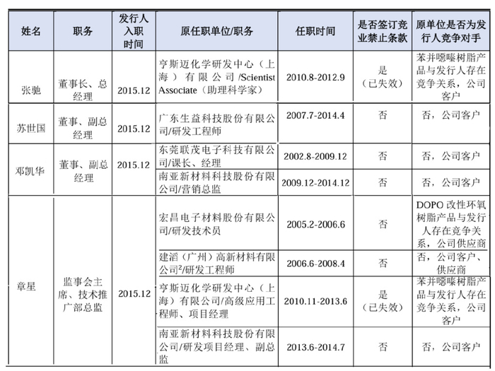 「创业最前线」梳理发现,苏世国曾在生益科技工作7年,担任研发工程师;邓凯华、章星均曾任职于南亚新材;章星还曾在建滔集团旗下的广州建滔工作。