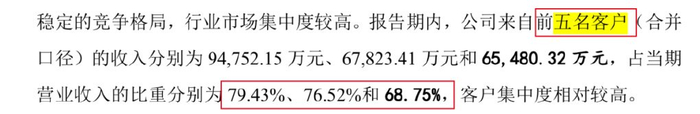 依靠这些客户迅速发展起来的同宇新材,如今难以摆脱大客户依赖症。2022年至2024年(以下简称:报告期),来自前五大客户的收入占当期营收的比重一直保持在68%以上。在这期间,南亚新材、建滔集团、生益科技一直是公司的前五大客户。