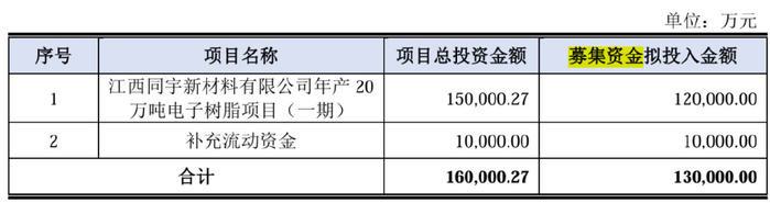 此次IPO,同宇新材拟募集资金13亿元,其中12亿元用于扩产,即江西同宇新材料有限公司年产20万吨电子树脂项目(一期)(以下简称:江西同宇项目)。