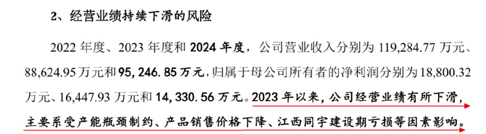 从结果来看,公司业绩已经受到影响。招股书显示,2022年至2024年,同宇新材实现营收11.93亿元、8.86亿元和9.52亿元,起伏不定;归母净利润分别为1.88亿元、1.64亿元、1.43亿元,出现两连降。