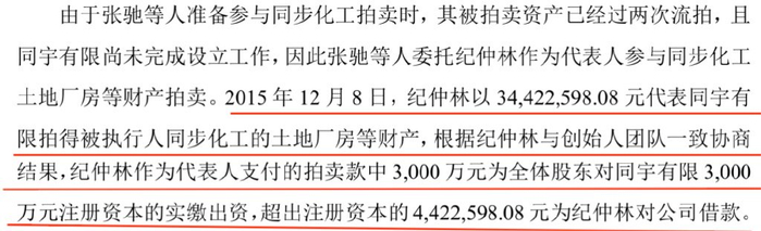 同宇有限正式成立之前,纪仲林先参与了同步化工的土地厂房拍卖,并以3442.26万元拍得上述财产,其中3000万元视为注册资本的实缴出资,超出注册资本的442.26万元为纪仲林对公司的借款。