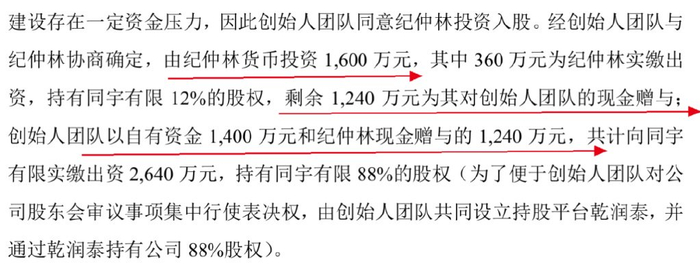 在同宇有限创立之时,纪仲林决定投资1600万元。其中只有360万元是对公司的投资,对应12%股权。与此同时,纪仲林将剩余1240万元现金赠与张驰带领的创始团队,乾润泰最终获得88%股权。