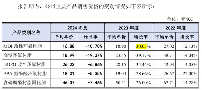 客户集中度高意味着议价能力弱,而同宇新材的主要产品售价已经下滑。目前,其主要产品包括MDI改性环氧树脂、高溴环氧树脂、DOPO改性环氧树脂、BPA型酚醛环氧树脂、含磷酚醛树脂固化剂等系列。