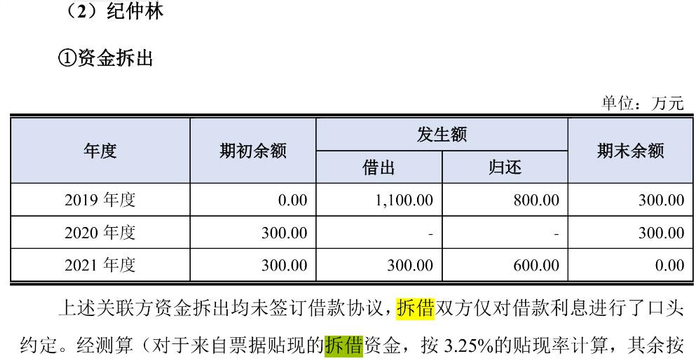 虽然“拱手让出”大股东之位,但纪仲林在同宇新材的地位非同一般。2019年,纪仲林向公司拆借1100万元;2021年,又拆借300万元。对于这些借款,公司并未签订借款协议,对借款利息也仅进行了口头约定。
