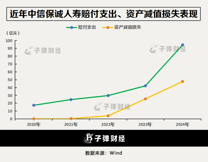 2023年及2024年,中信保诚人寿的赔付支出分别为42.16亿元、94.48亿元,分别增长12.41亿元、52.32亿元;资产减值损失为25.51亿元、47.75亿元,分别增长21.6亿元、22.24亿元。