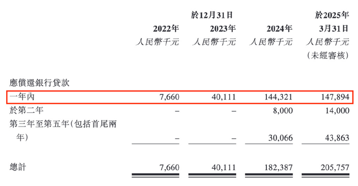 2022年、2023年、2024年以及2025年第一季度,拓璞数控的一年内应偿还银行贷款数额分别为766万元、4011.1万元、1.44亿元和1.48亿元。