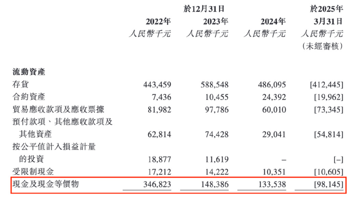 2024年,公司的现金储备为1.34亿元,已经低于其短期负债1.44亿元,资金缺口1000万元;到2025年3月31日,公司的现金储备已经降至9814.5万元,同期的短期负债则达到了1.48亿元,资金缺口扩大至约4986万元。