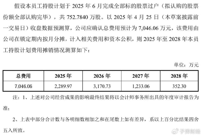 假设持股计划于2025年6月完成,以2025年4月25日(草案披露前一交易日)收盘数据预测算,预计产生7046万元费用,未来三年按月分摊,计入相关费用和资本公积。