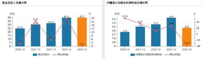 2024年,华厦眼科营收40.27亿元,同比微增0.34%,较2023年同期的40%明显放缓。归母净利润更是出现了上市以来的首次下滑,仅实现4.29亿元,同比下滑36%。