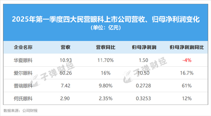 不过,这不是华厦眼科一家独有的现象。2024年,其他三大民营眼科上市公司——爱尔眼科、普瑞眼科、何氏眼科,营收与净利润增速集体放缓,甚至出现负增长。