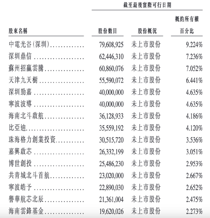但该公司目前并没有控股股东,上市前,中电光谷(深圳)持股9.224%、招银国际通过苏州招赢云腾持股7.052%、深圳鼎信持股7.236%、CPE源峰通过天津九天树和杭州泓聿合计持股8.336%、宁波波导持股4.635%、比亚迪与其员工跟投平台嘉兴创启开盈合计持股4.168%等。