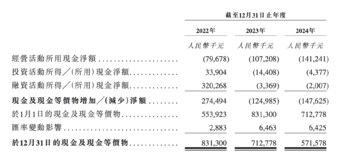 各期末的现金及现金等价物逐年减少,分别约为8.31亿元、7.13亿元和5.72亿元。经营性现金流净额连续3年为负,分别为-7967.8万元、-1.07亿元和-1.41亿元。