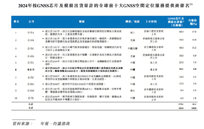 按双频高精度射频基带一体化GNSS定位芯片及模组出货量计,该公司在全球GNSS定位空间服务提供商中位居第4,在中国内地公司中位居第一,全球市场份额为10.5%。行业第一名的市场份额为32.3%。