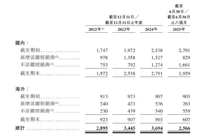 招股书显示,在收购Penlon和唯德康后,其经销商数量从2022年的2895家增加至2024年的3694家,但2025年6月末,公司的经销商仅剩2566家,较2024年末减少了1128家。