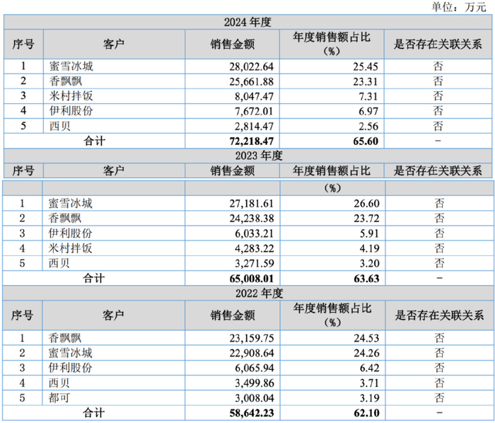从新天力披露的信息可以看到,公司还十分依赖前两大客户蜜雪冰城和香飘飘,在报告期内,这两大客户合计占新天力销售收入的比重分别为48.79%、50.33%和48.76%。