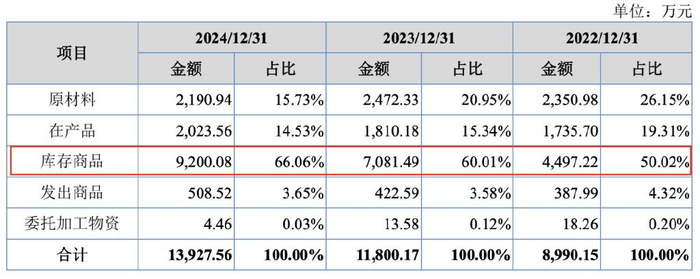 招股书显示,新天力的库存商品在存货的占比逐年升高,报告期内分别为50.02%、60.01%及66.06%。