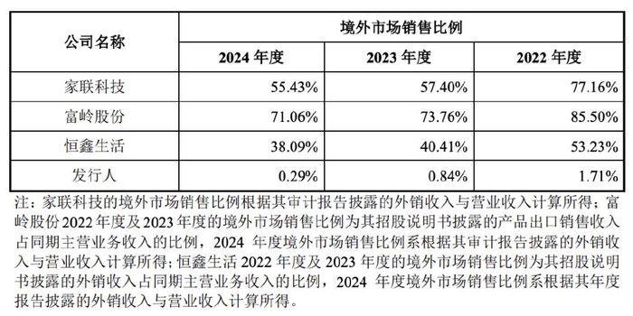 此外,新天力与家联科技、富岭股份和恒鑫生活的一大区别就是新天力的营收主要来自国内,而其他三家的业绩则大部分来自国外,境外市场销售比例较高。