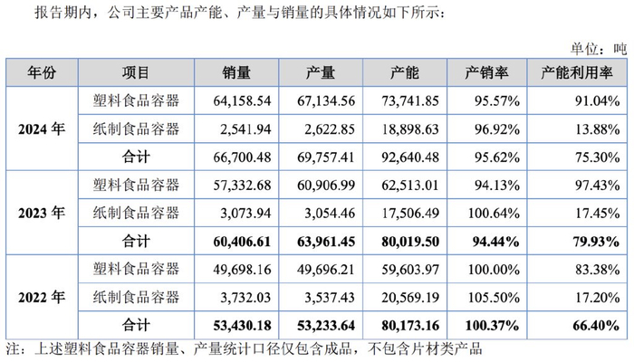 招股书还披露,报告期内,新天力的塑料食品容器产能利用率分别为83.38%、97.43%及91.04%。但综合产能利用率并不高,分别为66.4%、79.93%及75.3%。