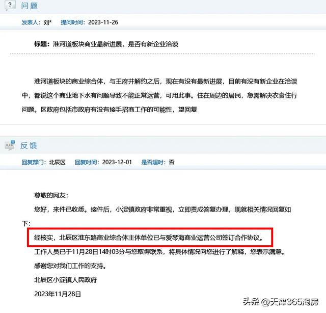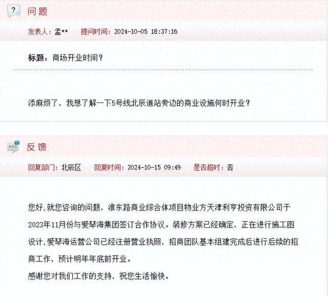 北辰区区委回复:淮东路商业综合体项目物业方天津利亨投资有限公司于2023年11月份与爱琴海集团签订合作协议。装修方案已经确定,正在进行施工图设计,爱琴海运营公司已经注册营业执照,招商团队基本组建完成后进行后续的招商工作,预计明年年底前开业。